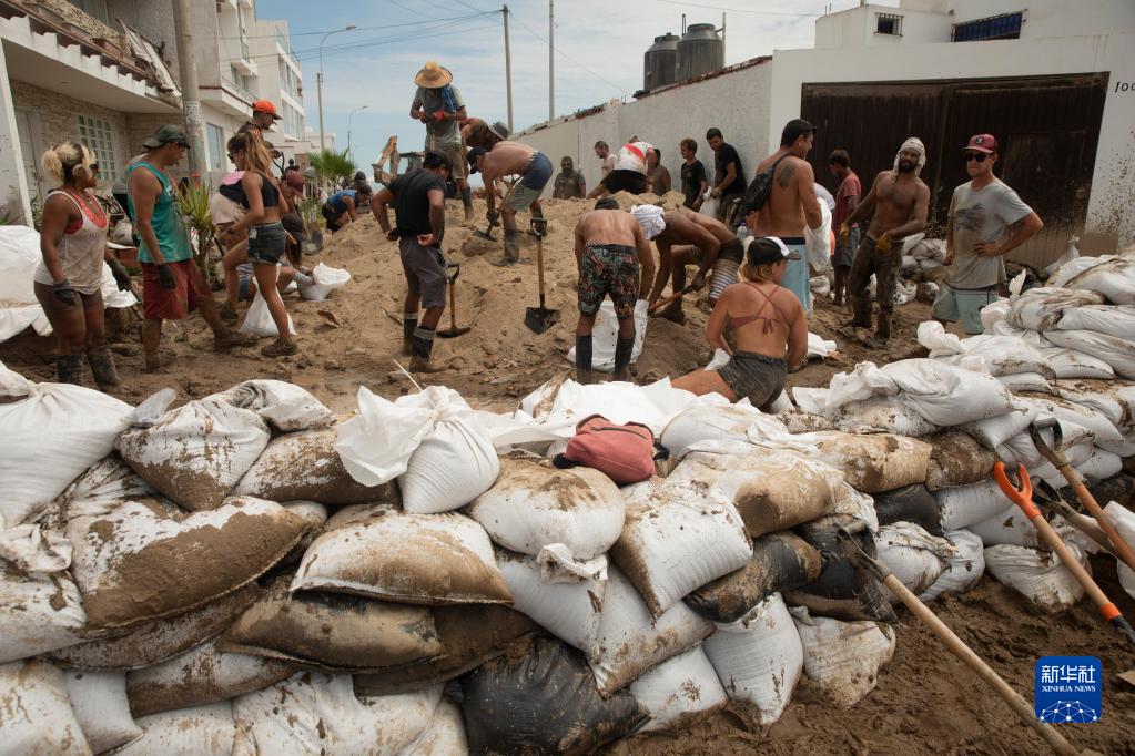 3月16日,人們在秘魯首都利馬南部的蓬塔赫爾莫薩地區建造臨時(shí)堤壩,以阻擋暴雨造成的泥石流。