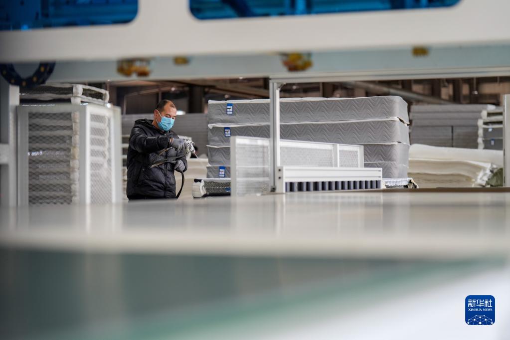 3月16日,河北省玉田縣窩洛沽鎮一家床墊制造企業(yè)的工人在生產(chǎn)線(xiàn)上工作。