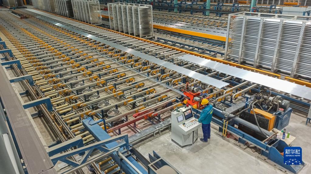 3月16日,山東省鄒平市禮德新能源科技有限公司工人在太陽(yáng)能板鋁合金邊框擠壓生產(chǎn)線(xiàn)上生產(chǎn)(無(wú)人機照片)。