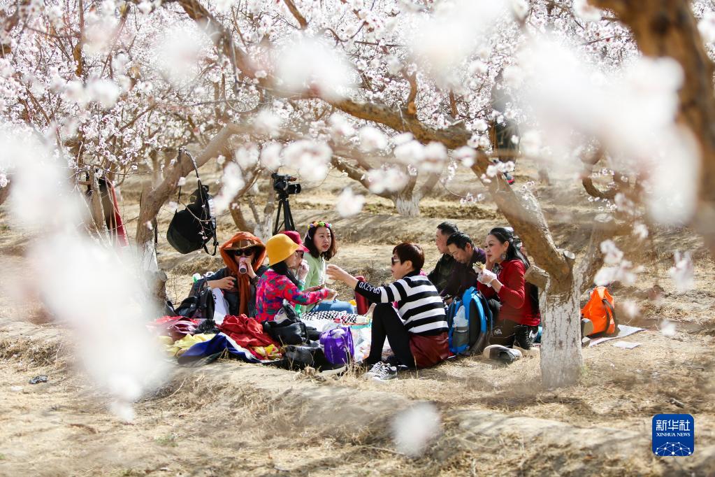 3月17日,游客在新疆吐魯番市托克遜縣夏鎮南湖村的杏林中游玩(無(wú)人機照片)。