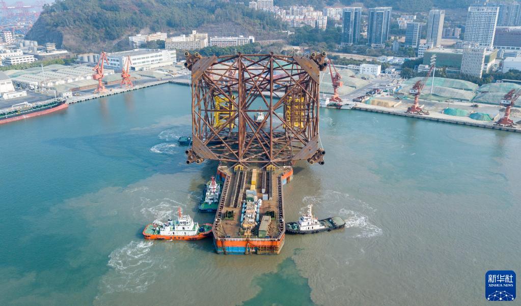 3月17日,在深圳赤灣海洋工程碼頭,“海洋石油228”運輸駁船搭載著(zhù)恩平20-4平臺導管架啟航(無(wú)人機照片)。