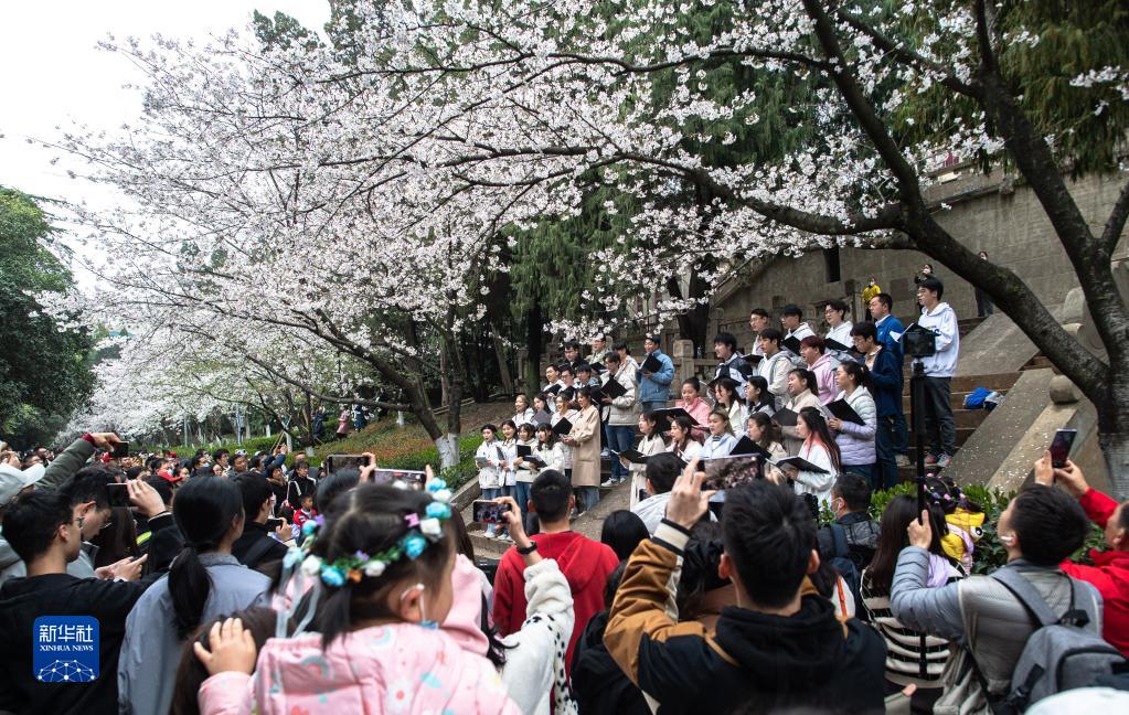 3月18日,武漢大學(xué)海燕合唱團在賞櫻現場(chǎng)演唱歌曲。