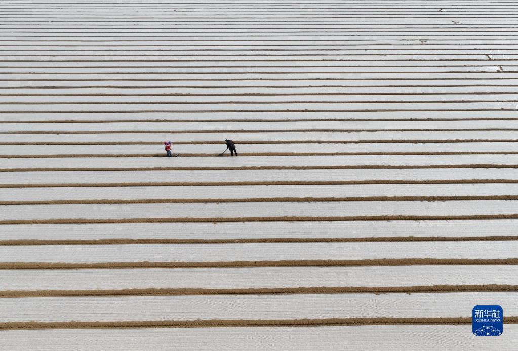 3月18日,唐山市曹妃甸區第六農場(chǎng)一家農業(yè)合作社的社員在田間勞作(無(wú)人機照片)。