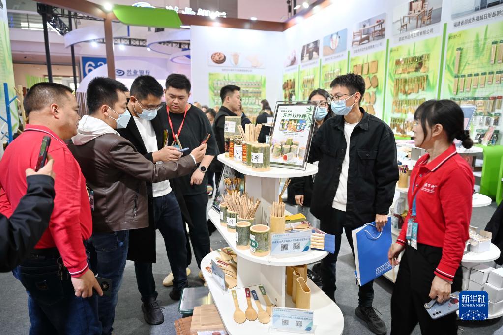 3月18日,參觀(guān)者在了解竹木制品信息。