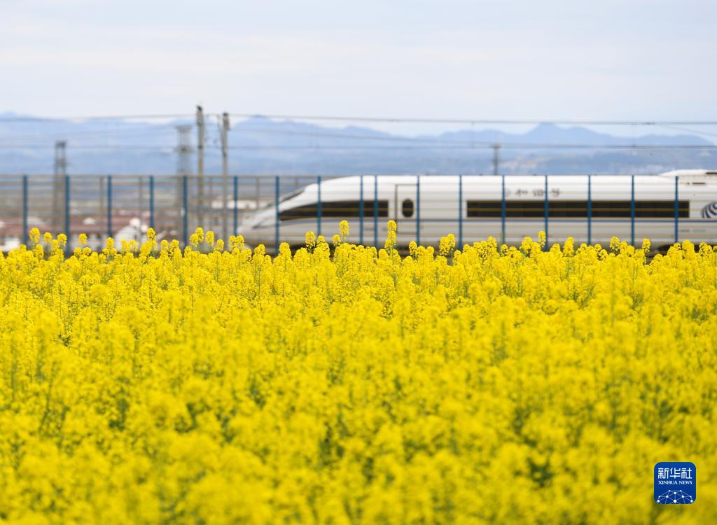 高鐵列車(chē)駛過(guò)漢中市洋縣洋州街道的油菜花海(3月17日攝)。
