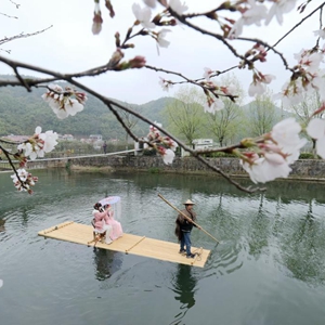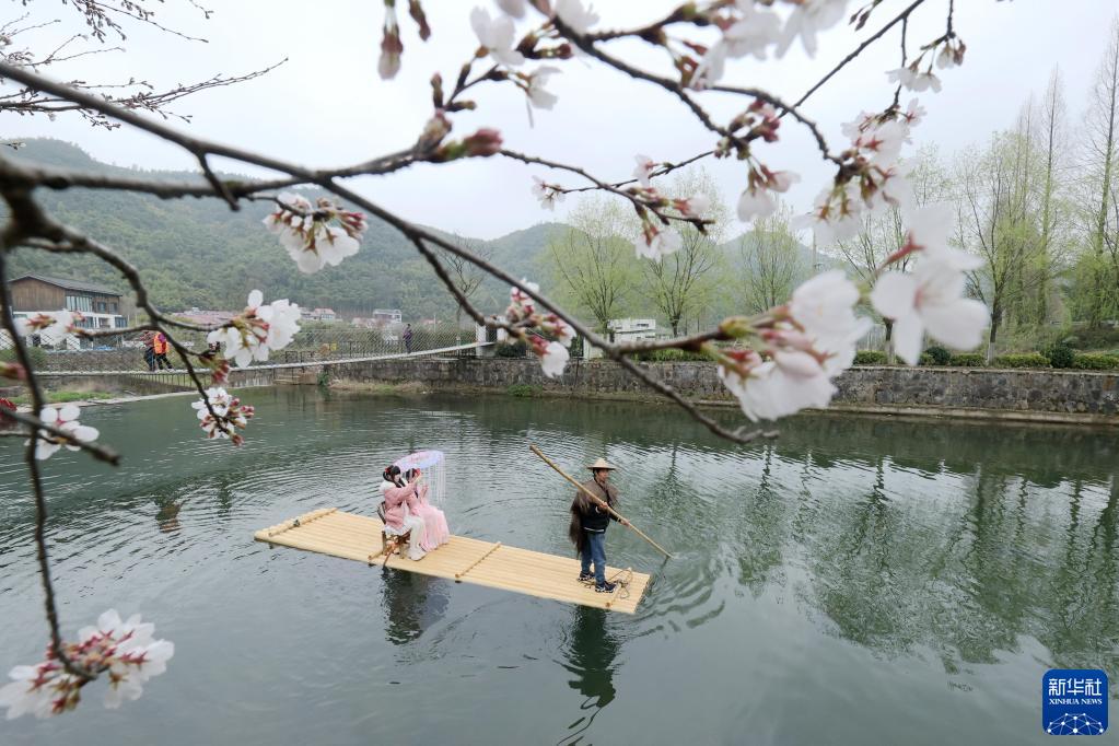 3月18日,游客在湖州市德清縣莫干山鎮佛堂村乘竹筏賞櫻花。