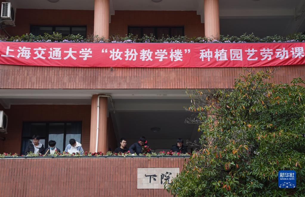 3月18日,在上海交通大學(xué)的種植園藝勞動(dòng)課上,學(xué)生在教學(xué)樓走廊邊的種植盆內栽種花草。