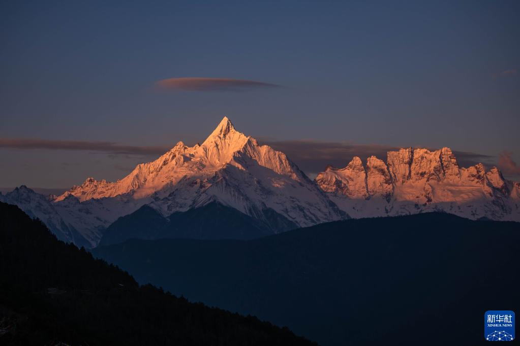 3月10日日出時(shí)分拍攝的梅里雪山,皚皚雪峰在金色晨光映照下如披金紗。梅里雪山位于云南省迪慶藏族自治州德欽縣與西藏自治區林芝市察隅縣交界處,是世界自然遺產(chǎn)“三江并流”的主要景觀(guān)之一。