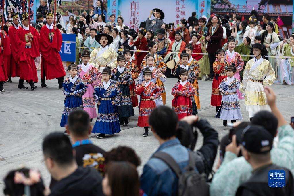 3月18日,在2023年中華民族服飾展演暨閬中漢服紀開(kāi)幕式上,漢服愛(ài)好者列隊巡游閬中古城。