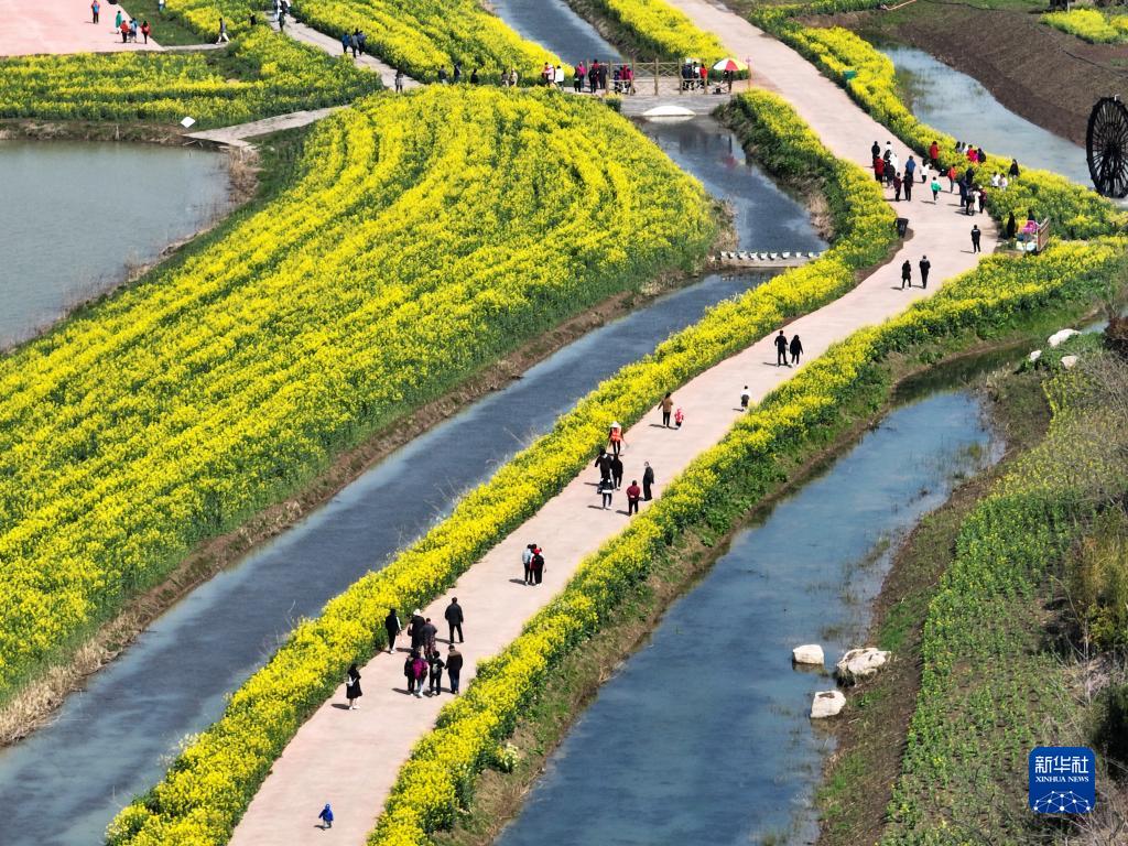 3月18日,游客在江蘇揚州高郵湖上花海景區踏青賞花(無(wú)人機照片)。