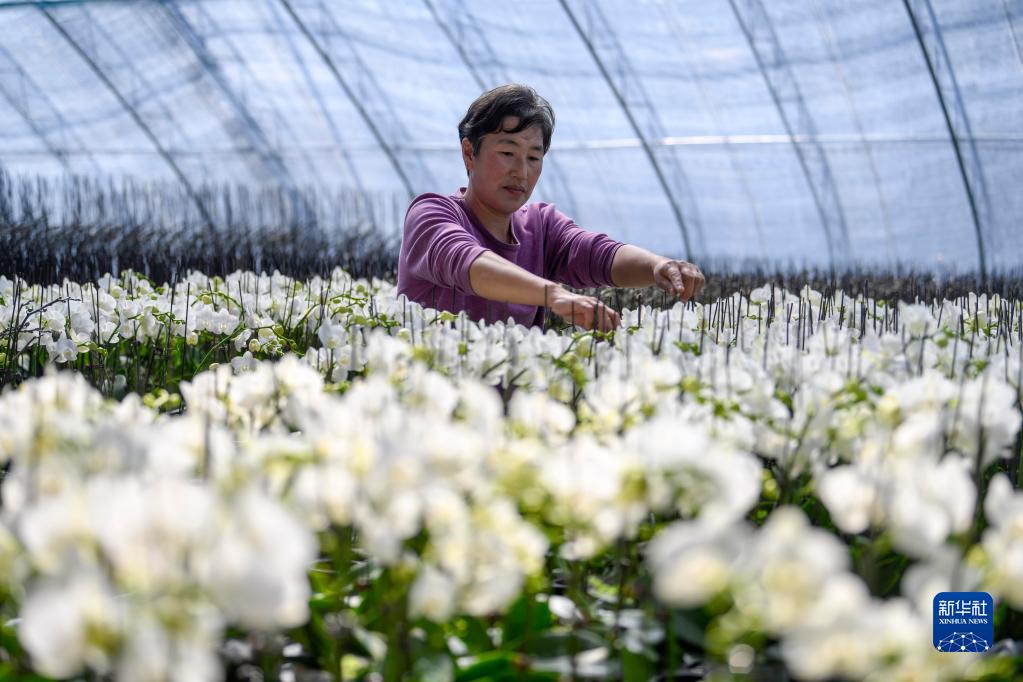 3月18日,在雙灤區大貴口村一處大棚,農民在管護鮮花。