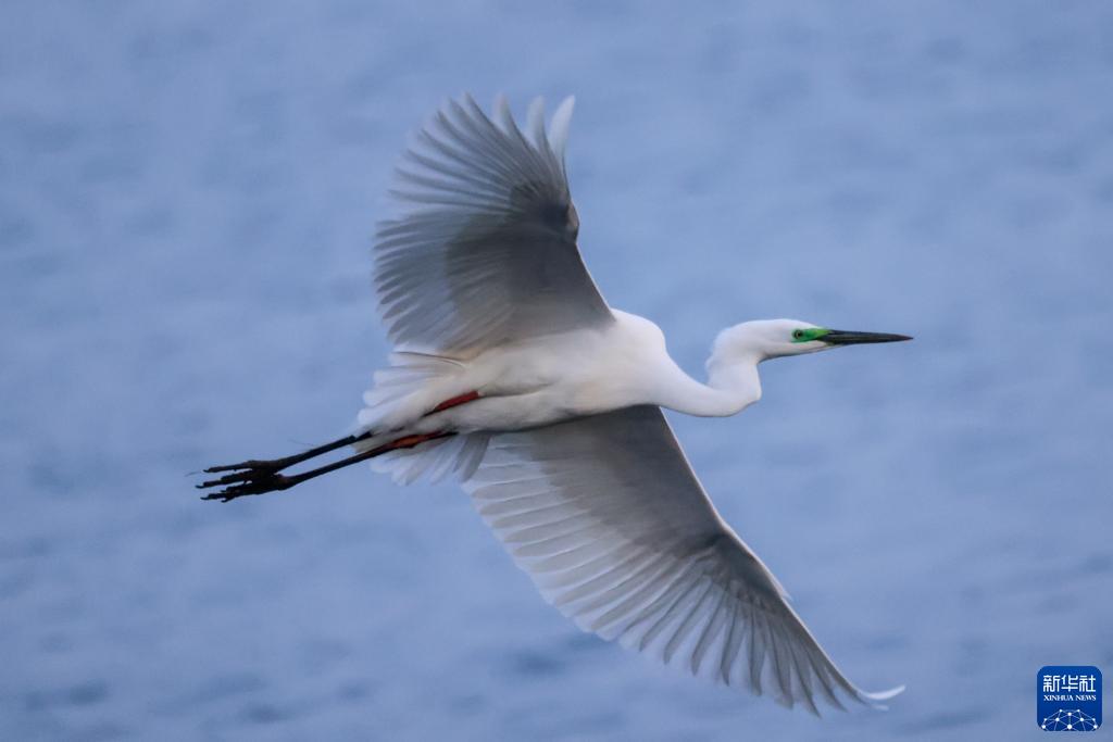 一只大白鷺在新疆博斯騰湖面飛翔(3月18日攝)。