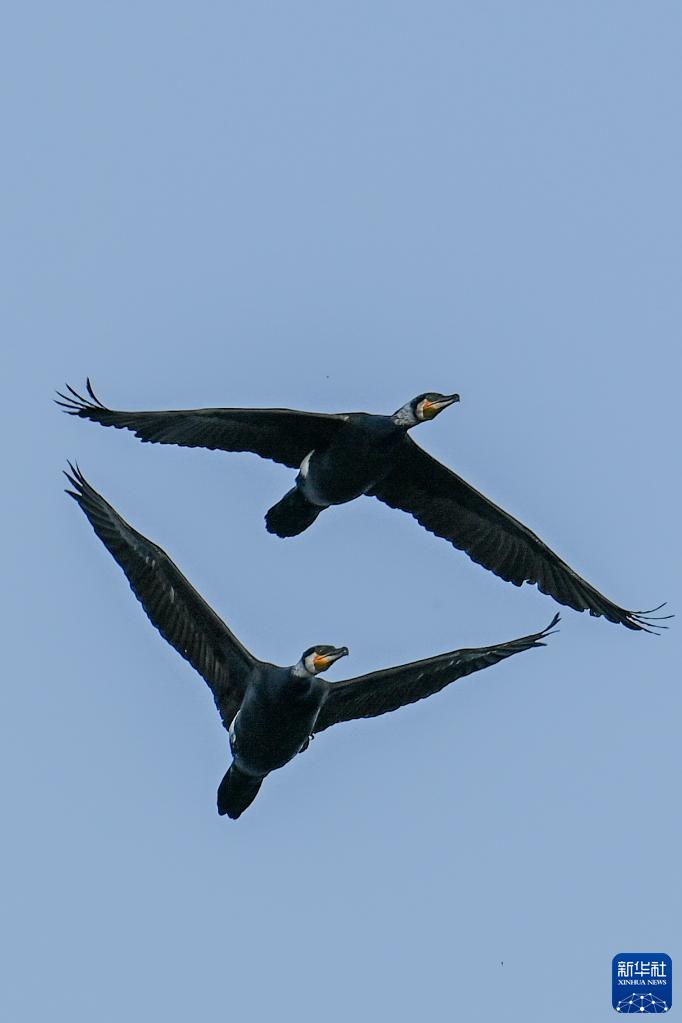 兩只鸕鶿在新疆博斯騰湖上空飛翔(3月17日攝)。
