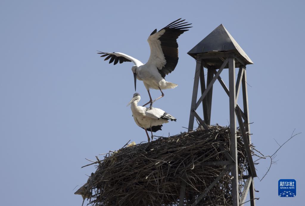 3月19日,東方白鸛在唐山市豐南區沿海濕地鐵塔上的巢穴上嬉戲。