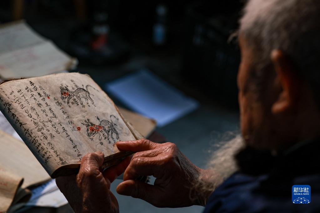 3月10日,水書(shū)先生潘秀業(yè)在家中閱讀水書(shū)文獻。