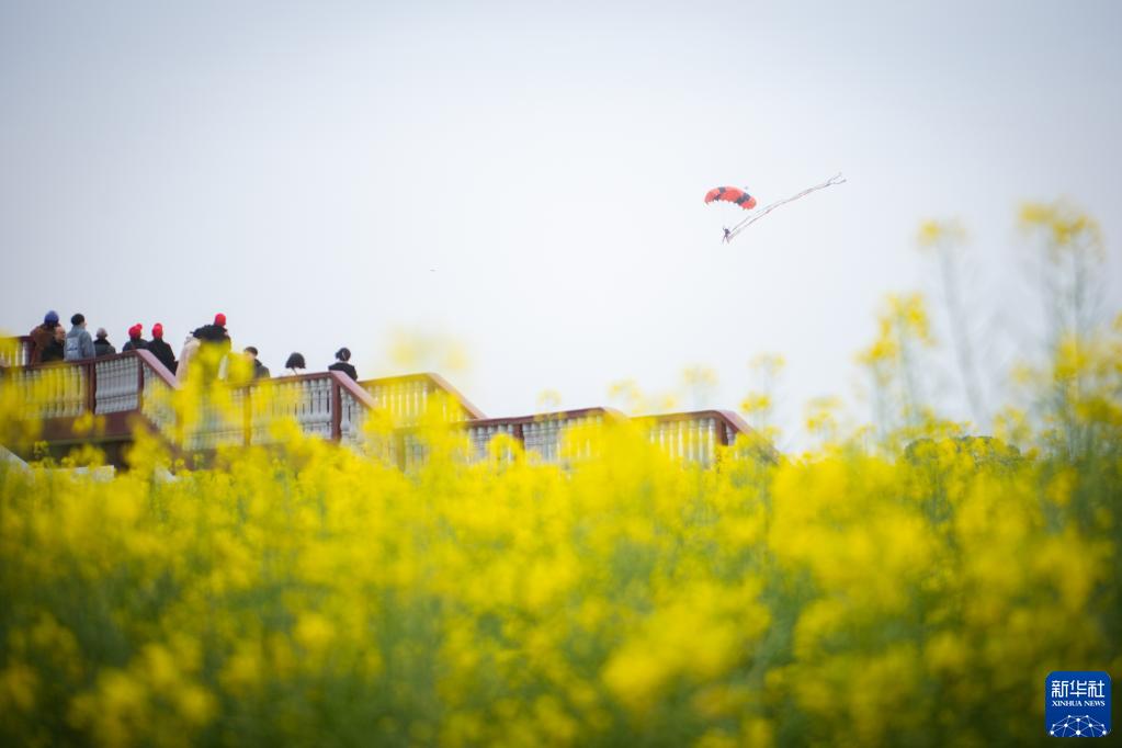 3月18日,游客在油菜花節核心景區觀(guān)看跳傘表演。