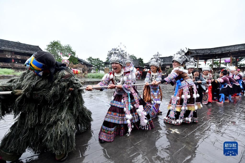 3月19日,在廣西融水苗族自治縣雙龍溝森林旅游度假區夢(mèng)嗚苗寨,來(lái)自廣東省湛江市的游客在體驗當地民俗。
