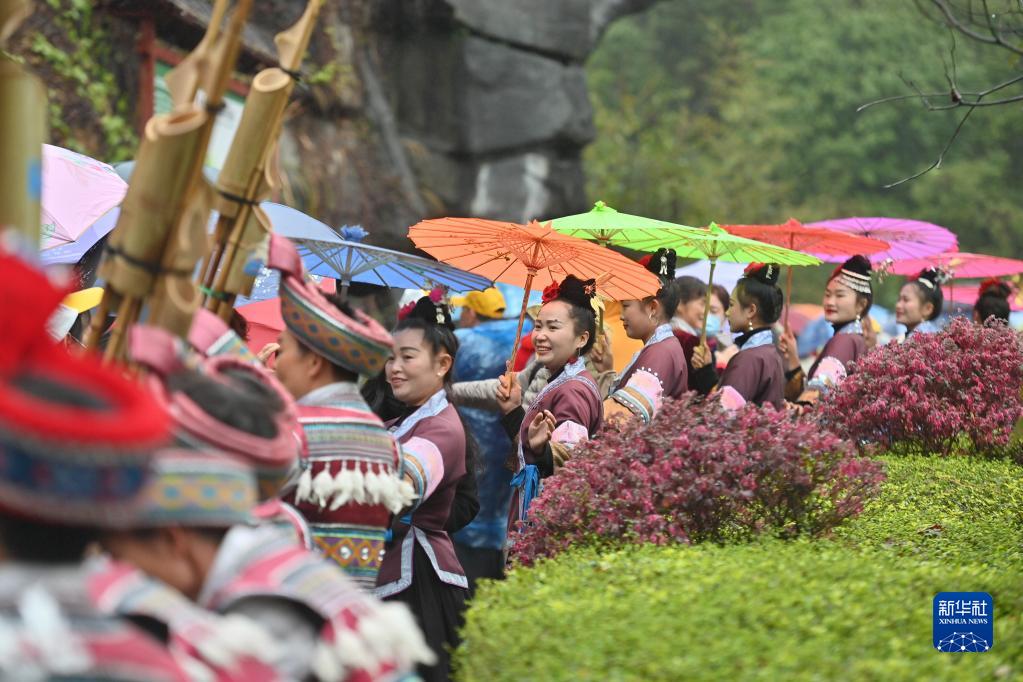 3月19日,在廣西融水苗族自治縣雙龍溝森林旅游度假區,苗族同胞用歌舞歡迎來(lái)自廣東省湛江市的游客。