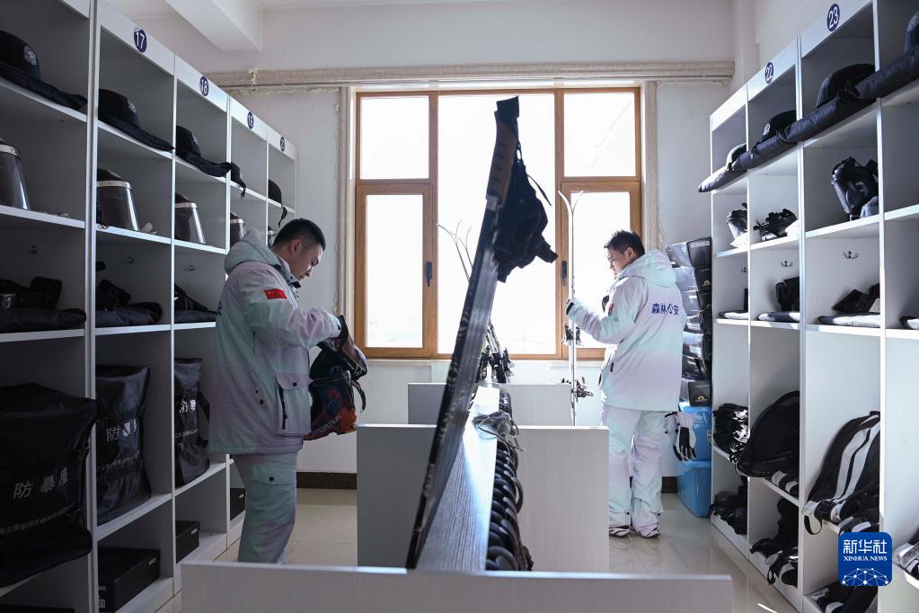 這是2023年2月7日,松江河森林公安分局雪上巡邏案件偵查大隊的許重陽(yáng)(右)和張迪在巡邏出發(fā)前準備雪具。