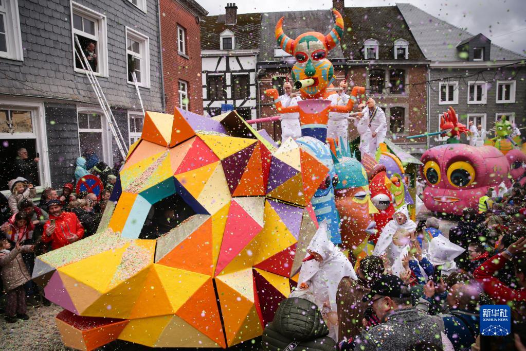 3月19日,在比利時(shí)東部的小城斯塔沃洛舉行的狂歡節游行上,表演者向人們拋灑碎紙片。