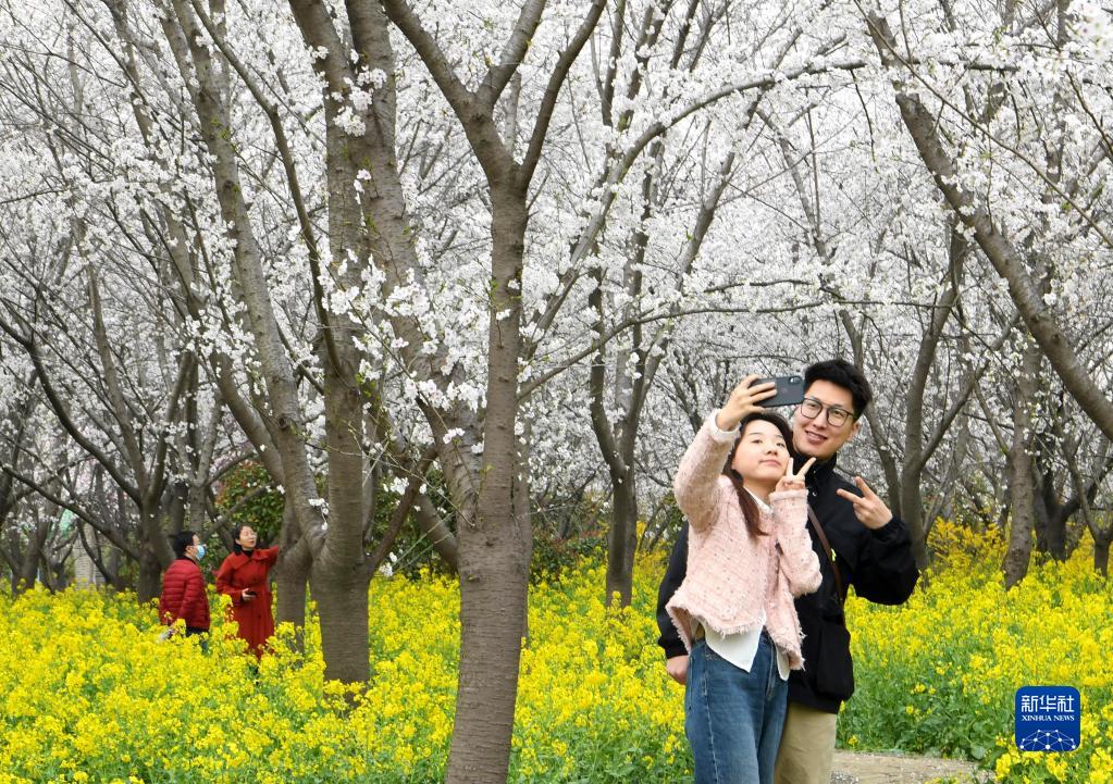 春到中原,河南省許昌市鄢陵縣唐韻櫻花園內櫻花、玉蘭花、油菜花競相綻放,成了市民踏青賞春的好去處。
