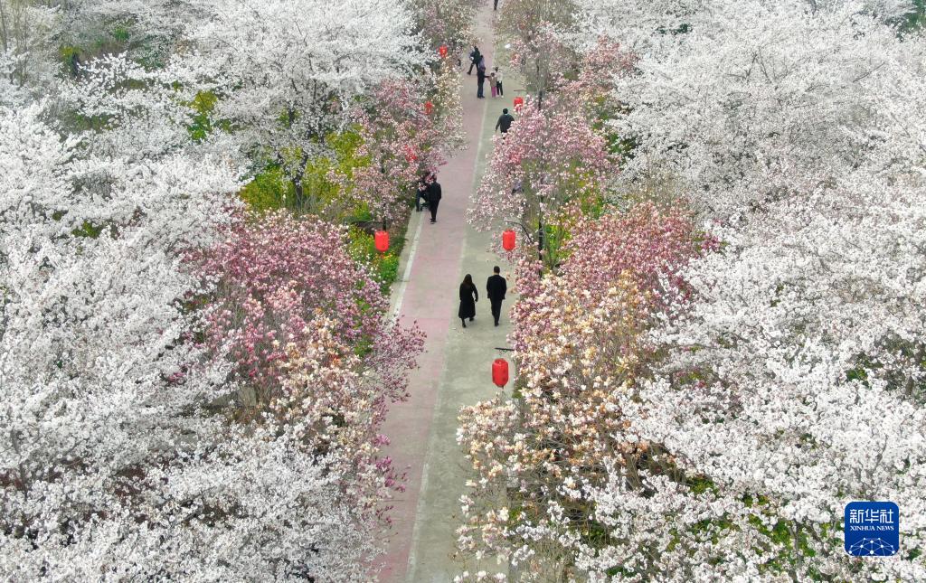 春到中原,河南省許昌市鄢陵縣唐韻櫻花園內櫻花、玉蘭花、油菜花競相綻放,成了市民踏青賞春的好去處。