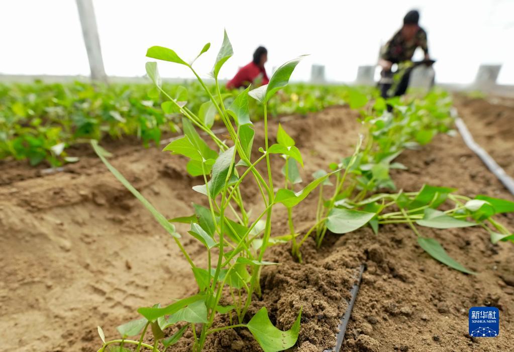 3月20日,河北省盧龍縣印莊鎮甘薯脫毒苗培育基地的工人在大棚內栽植脫毒甘薯種苗。