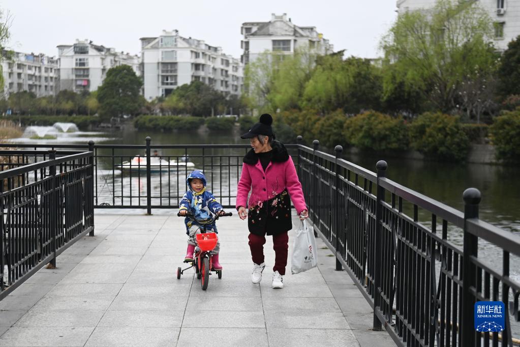 居民帶著(zhù)小朋友在浙江省寧波市北侖區中河畔的游步道休閑(3月16日攝)。