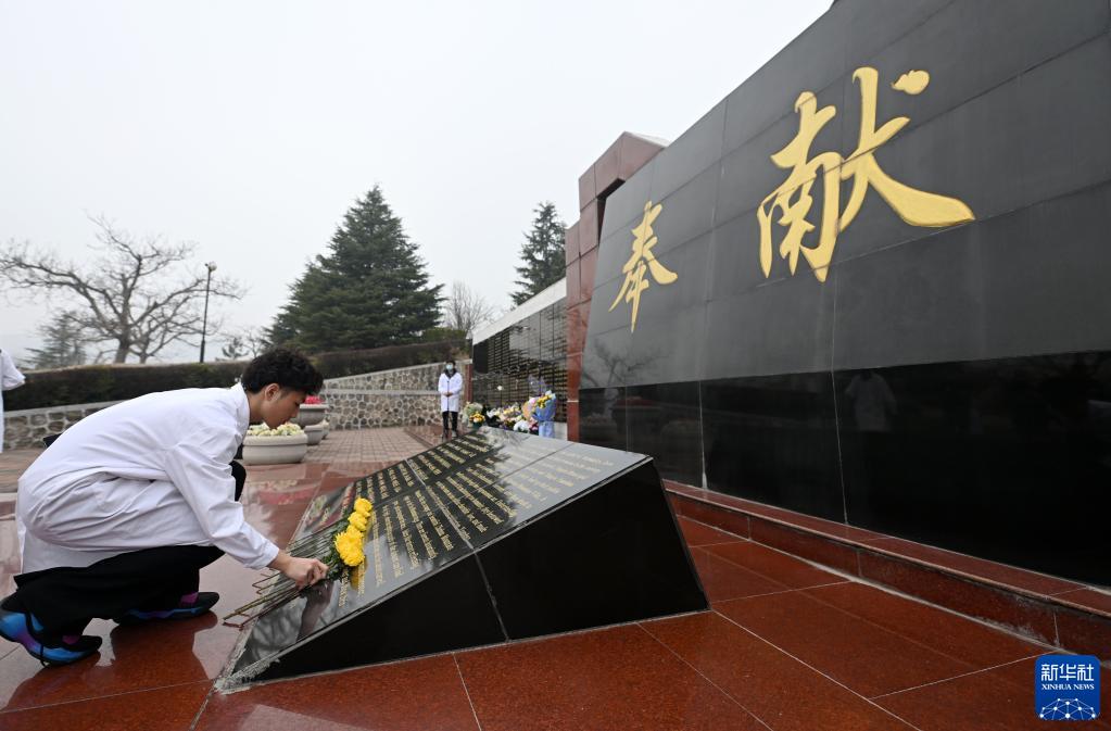 3月21日,在天津市薊州區元寶山莊生命紀念公園,天津醫科大學(xué)學(xué)生在奉獻碑前獻花。