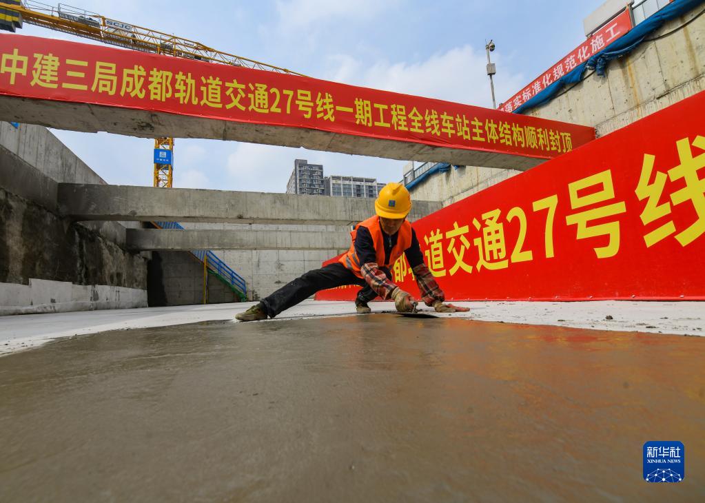 3月21日,在成都地鐵27號線(xiàn)金府站,中建三局的施工人員在進(jìn)行混凝土抹平作業(yè)。