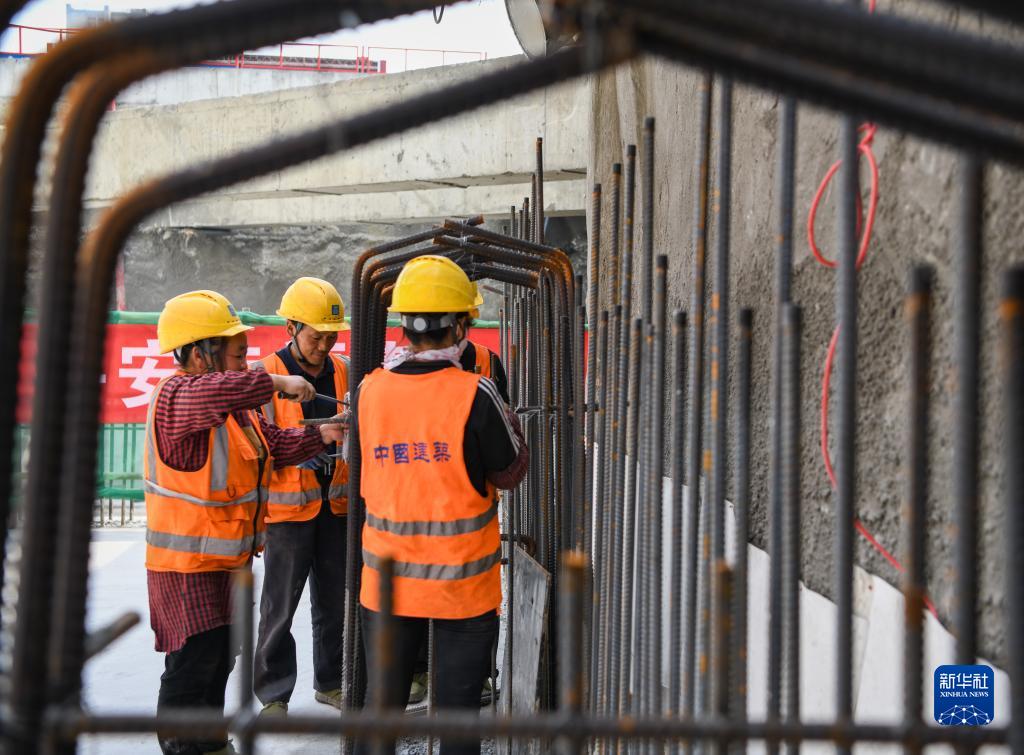 3月21日,在成都地鐵27號線(xiàn)金府站,中建三局的施工人員在綁扎鋼筋。