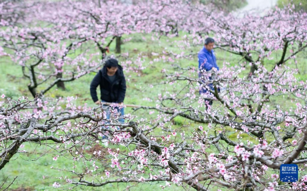 3月21日,農民在貴州省銅仁市萬(wàn)山區魚(yú)塘鄉江屯村的果園里勞作。