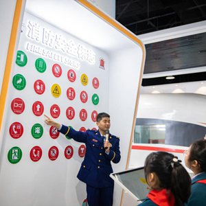 3月21日,在常德市科技館,消防員指導學(xué)生認識消防安全標志。
