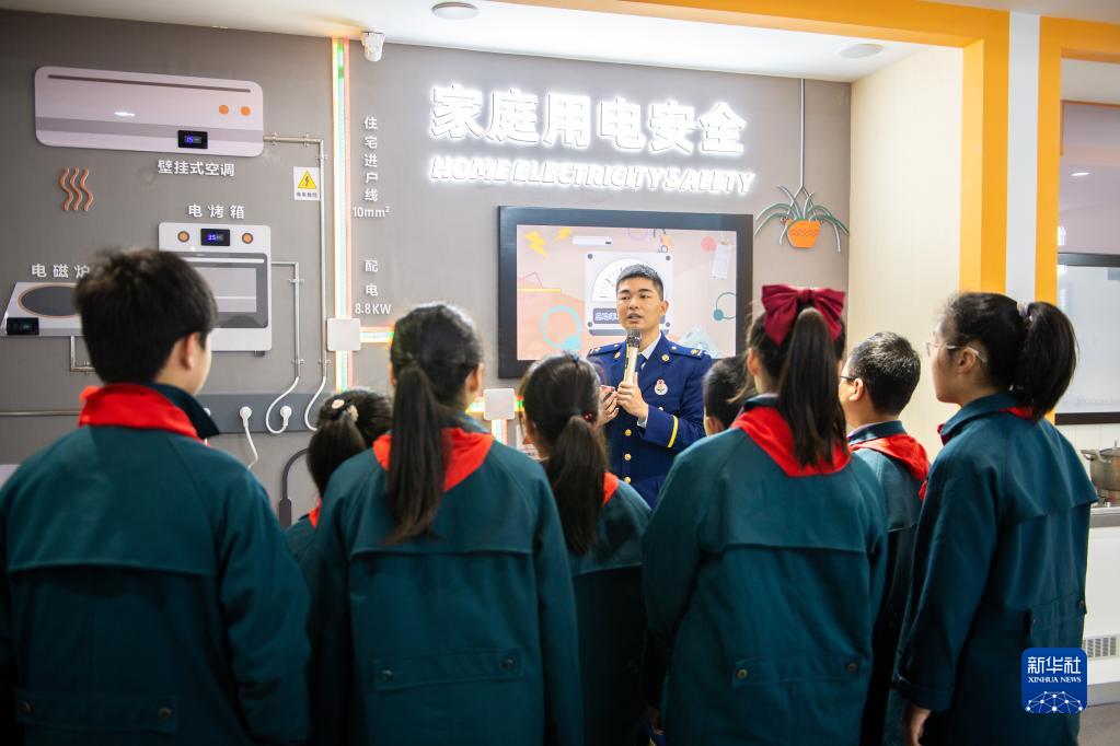 3月21日,在常德市科技館,消防員為學(xué)生講解家庭用電安全知識。