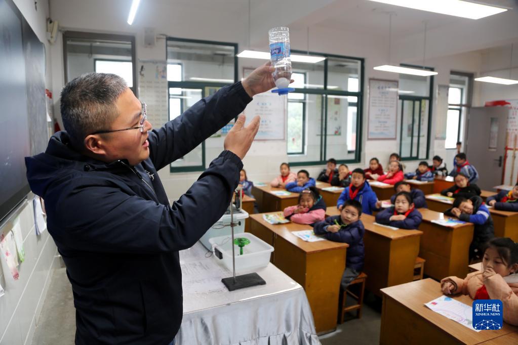 3月21日,江蘇省連云港市院前小學(xué)的老師為學(xué)生們演示節水小實(shí)驗。