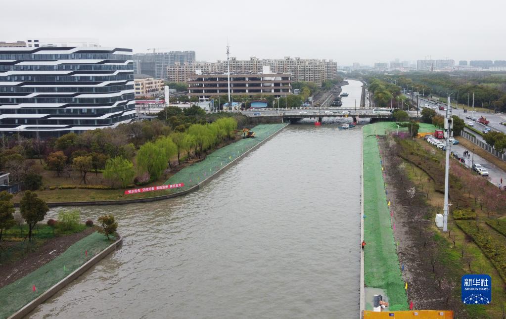 3月21日拍攝的位于洞涇港的松江新城綠環(huán)水脈建設現場(chǎng)(無(wú)人機照片)。