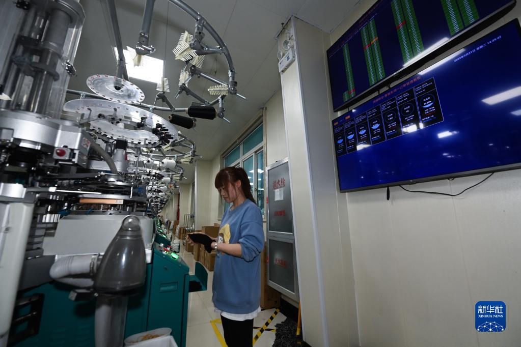 3月21日,在諸暨安華鎮的澗瀾襪業(yè)有限公司數字化車(chē)間內,全自動(dòng)襪機在生產(chǎn)襪子,所有生產(chǎn)數據都顯示在系統大屏幕上。