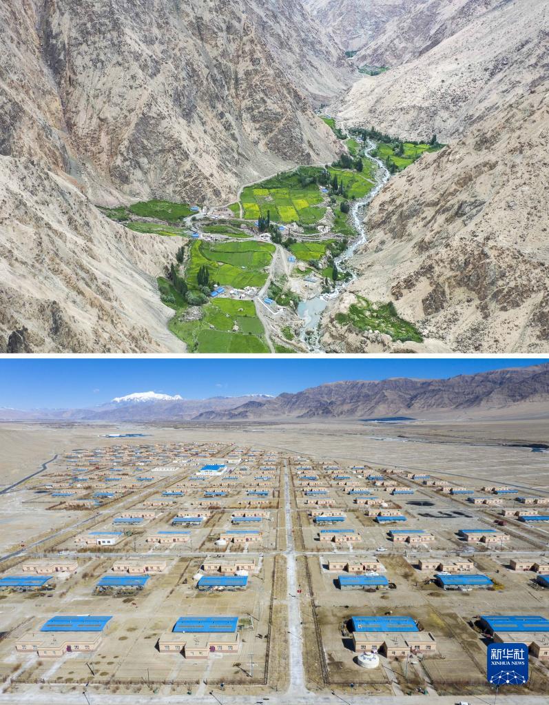 拼版照片:上圖為新娘古麗汗·贊加比力家易地扶貧搬遷前所住的馬爾洋鄉的山村一角(無(wú)人機照片,2019年6月28日攝);下圖為古麗汗家搬遷后所在的富民村、愛(ài)民村(無(wú)人機照片,2023年3月17日攝)。