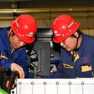 3月22日,中鐵長(cháng)安重工有限公司的工人在生產(chǎn)線(xiàn)上調試即將下線(xiàn)的95噸純電動(dòng)礦用自卸車(chē)。