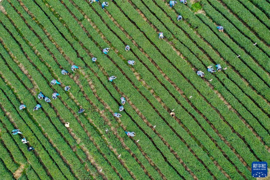 3月22日,在重慶市永川區永榮鎮鄉村振興就業(yè)園,采茶工在采摘茶葉(無(wú)人機照片)。