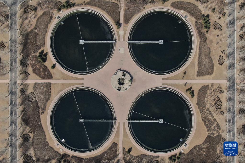 這是沈陽(yáng)南部污水處理廠(chǎng)二沉池,污水在二沉池通過(guò)物理的沉淀作用使泥水得到分離(3月17日攝,無(wú)人機照片)。