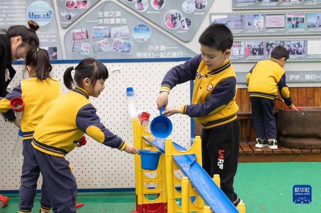 3月22日,浙江省諸暨市實(shí)驗幼兒園的小朋友在體驗模擬水循環(huán)裝置。