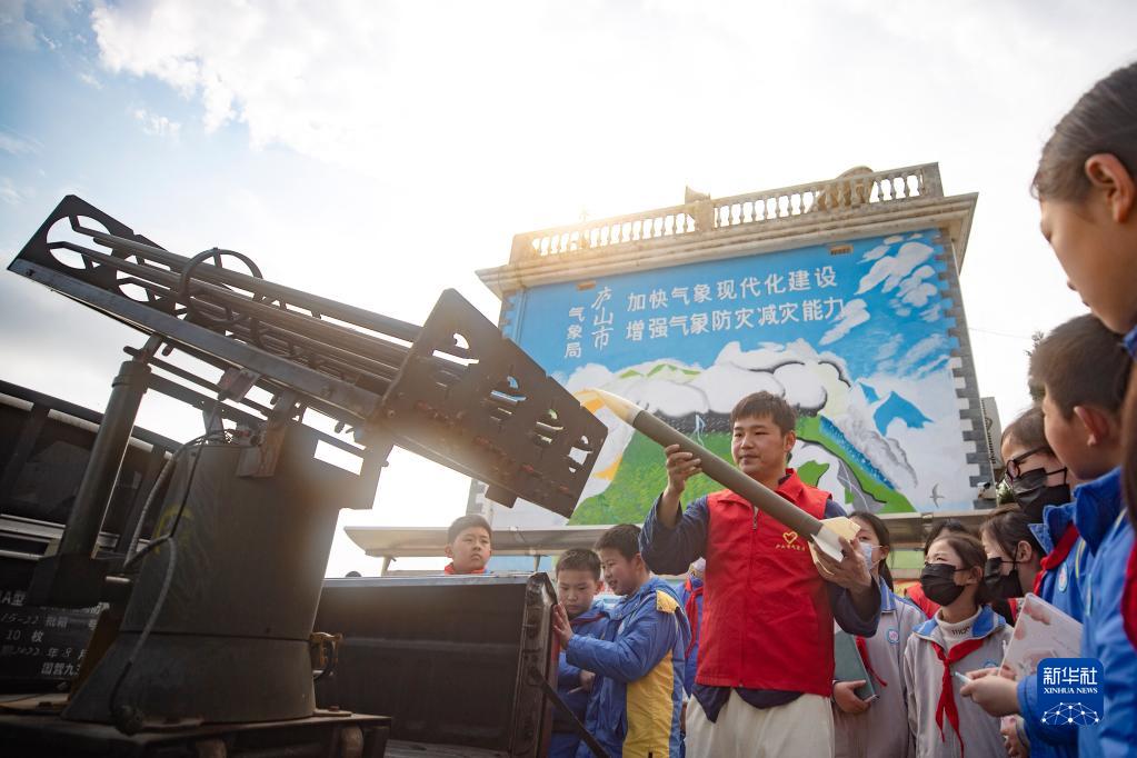 3月22日,在江西省廬山市,氣象局工作人員向小學(xué)生介紹人工增雨設備。