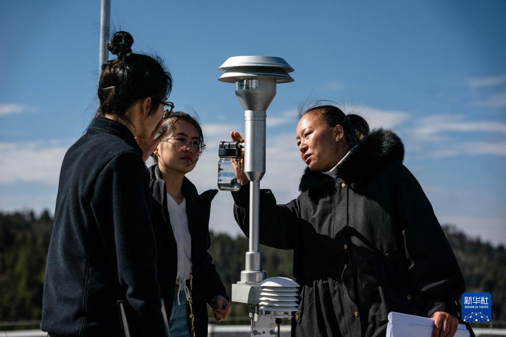 工作人員彭小清(右)和殷鉞淼(中)、李曉莉在香格里拉國家大氣本底站大氣成分業(yè)務(wù)用房進(jìn)行環(huán)境顆粒物進(jìn)氣口巡視(3月9日攝)。
