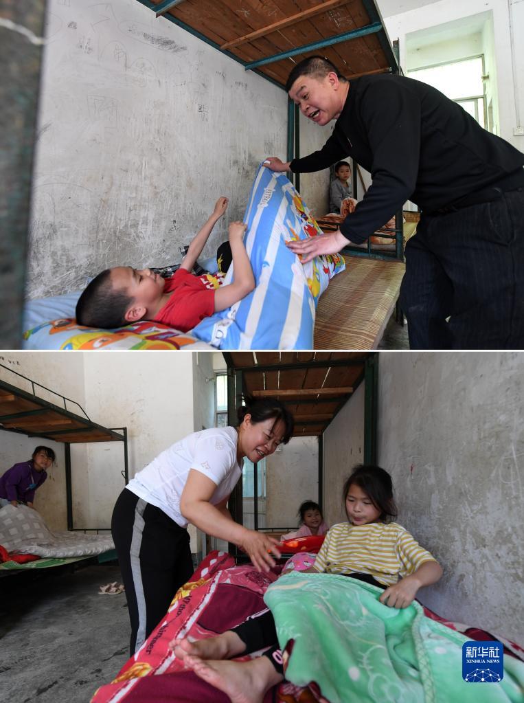 這是一張拼版照片:在廣西德??h東凌鎮那王小學(xué),黃永勇(上圖)和黃秀碧(下圖)在照顧學(xué)生午休(3月22日攝)。