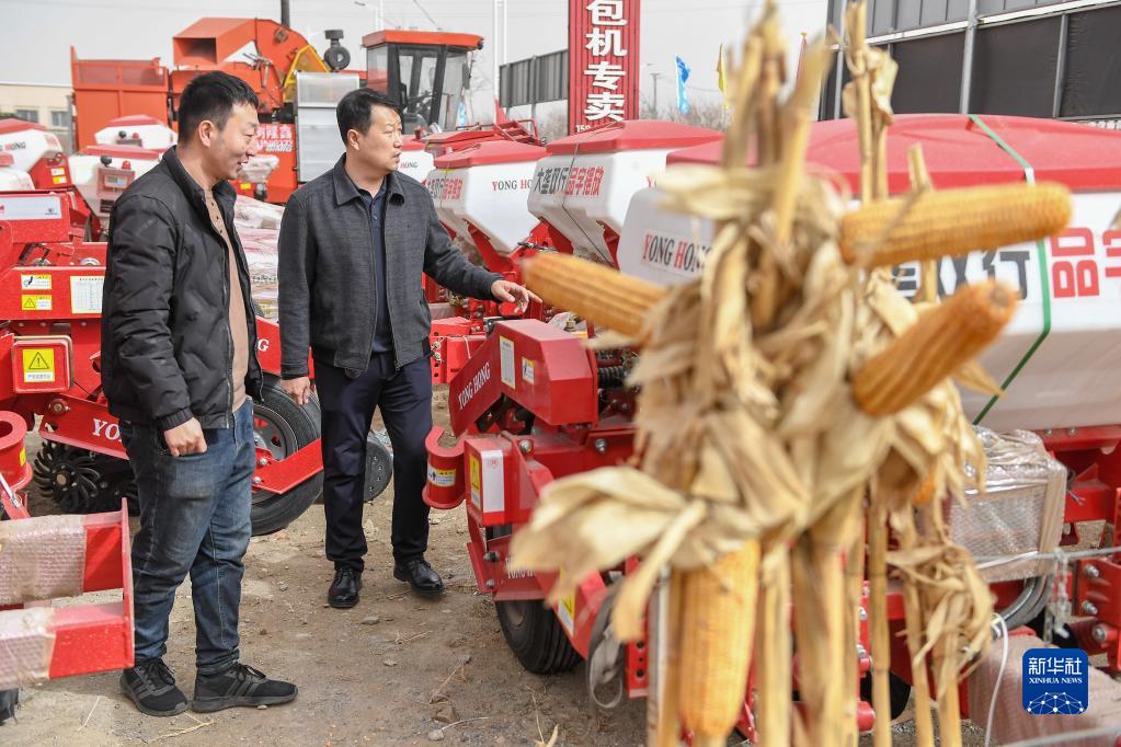 3月23日,在吉林省四平市梨樹(shù)縣一家農機銷(xiāo)售公司,梨樹(shù)縣農機推廣總站站長(cháng)張志剛(右)向經(jīng)銷(xiāo)商詢(xún)問(wèn)農機銷(xiāo)售情況。