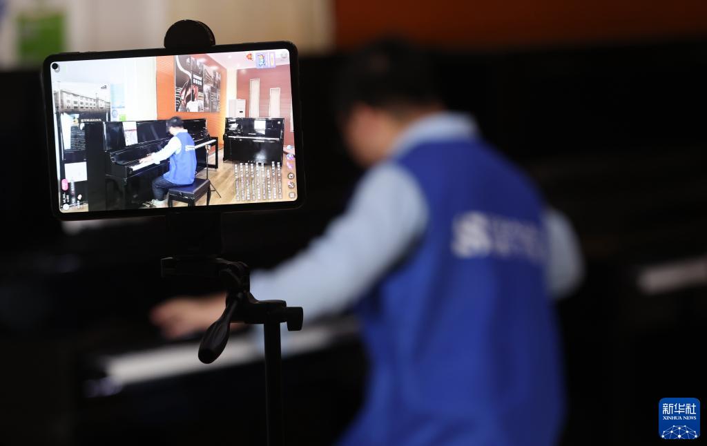 3月23日,德清縣洛舍鎮東衡村一家鋼琴制造企業(yè)的工作人員進(jìn)行直播推介。