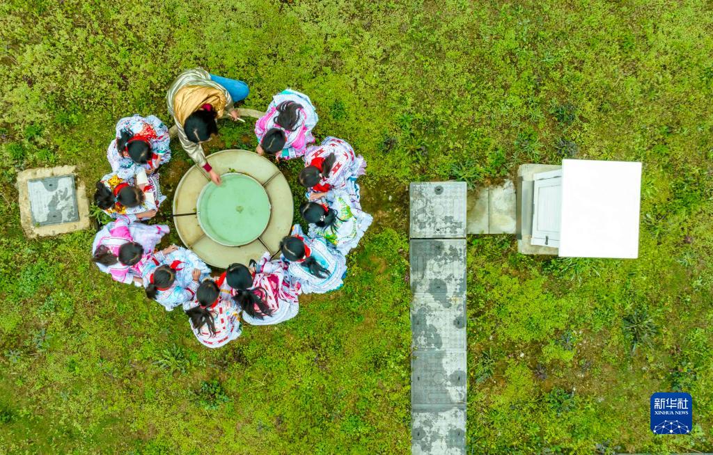 3月23日,學(xué)生在貴州省黔西市氣象局綜合氣象觀(guān)測站觀(guān)看大型蒸發(fā)皿(無(wú)人機照片)。