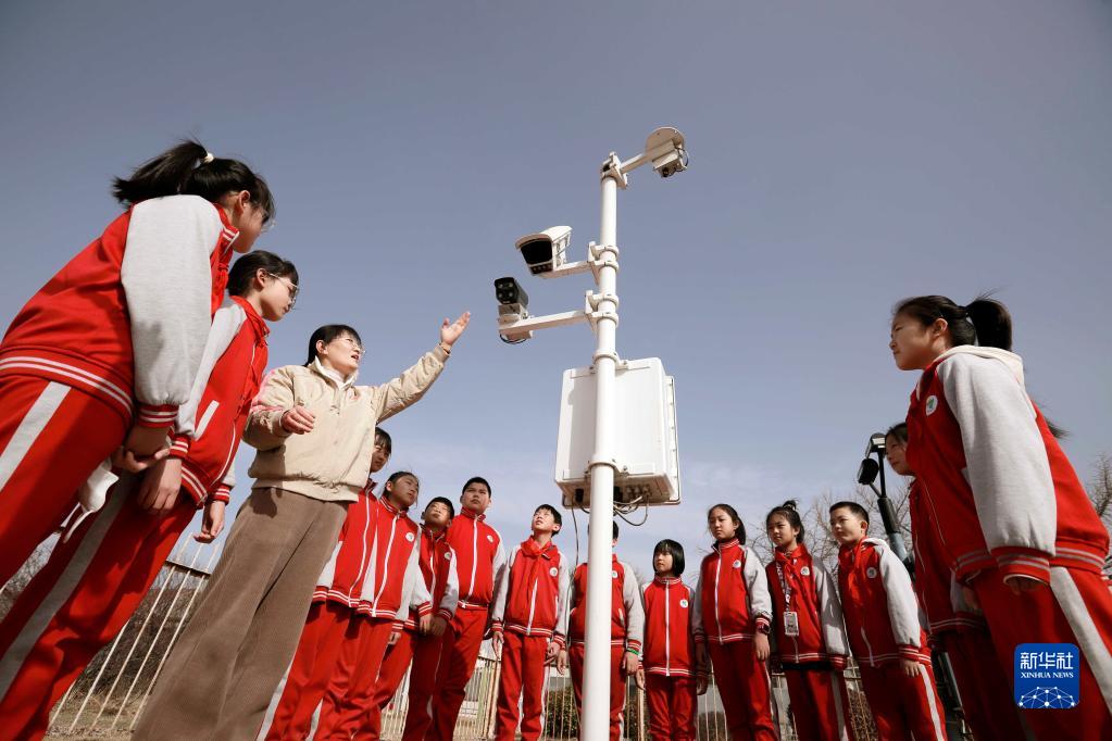 3月23日,在河北省遵化市氣象臺,工作人員為小學(xué)生介紹氣象觀(guān)測知識。