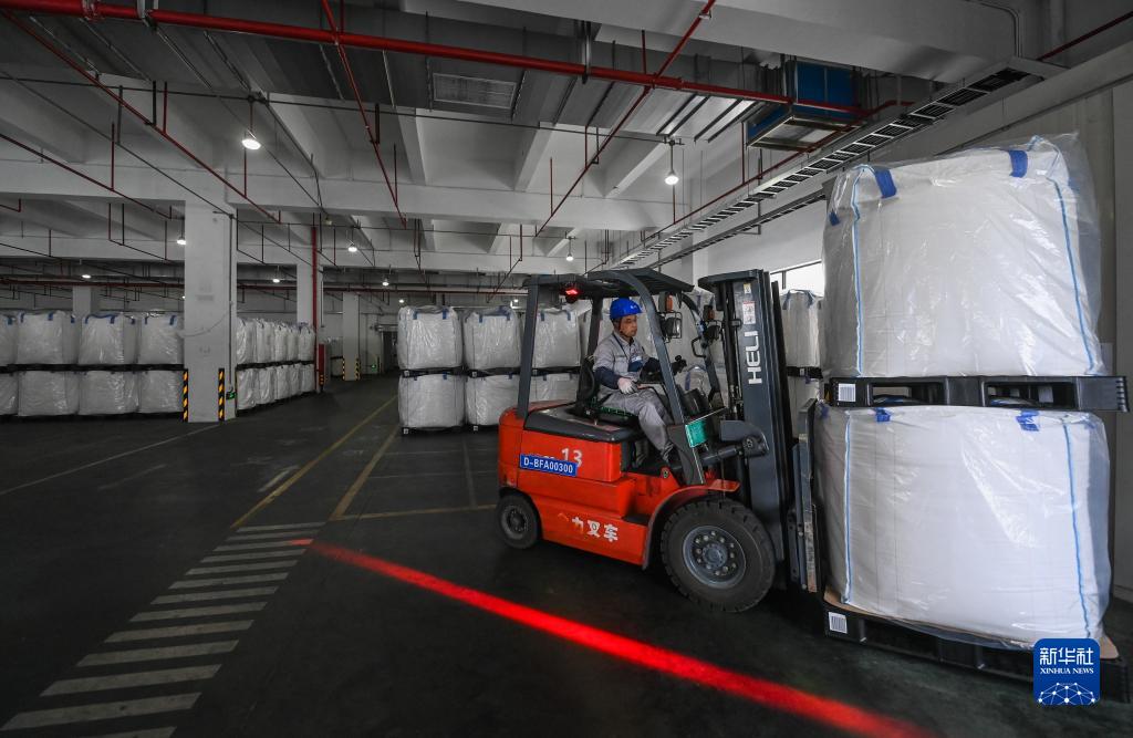在衛星化學(xué)股份有限公司高新區嘉興基地的成品倉庫備貨區,叉車(chē)司機在運輸產(chǎn)品(3月23日攝)。